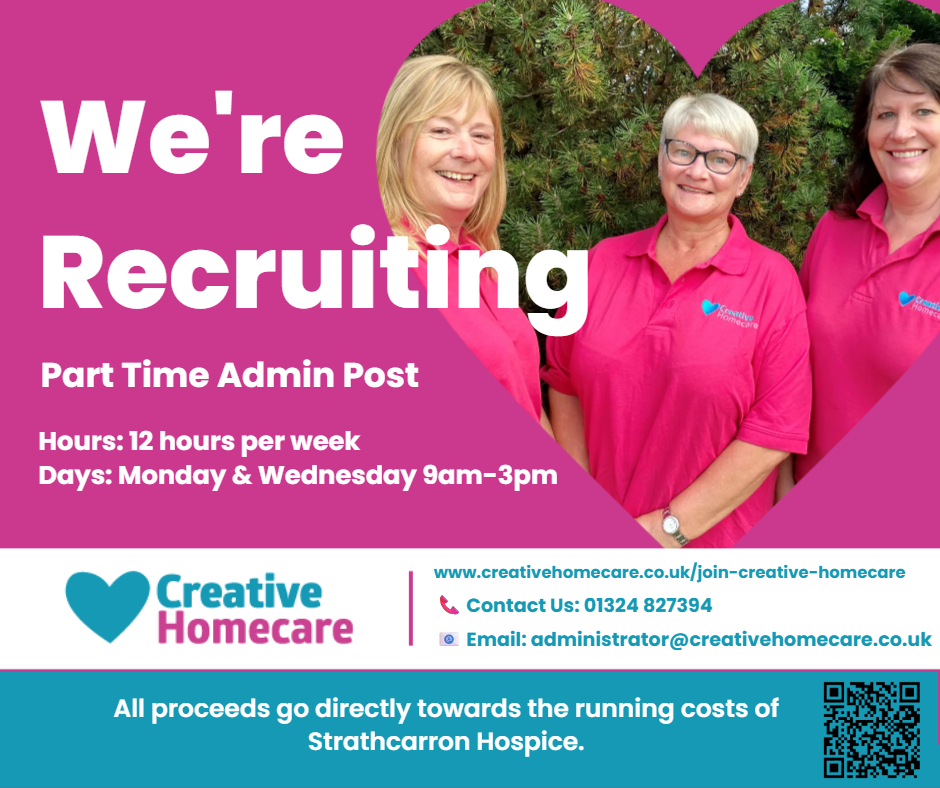 Creative Homecare recruitment advert for Homecare Support Worker in Falkirk – 20 hours per week, £12.60 per hour plus travel, profits support Strathcarron Hospice